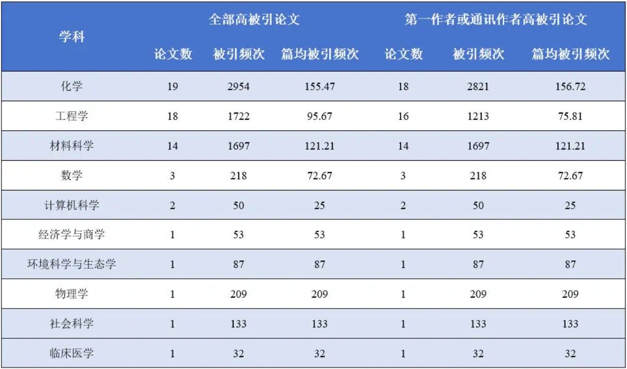 此次我校入选论文涉及化学、工程学、材料科学、数学、计算机科学、经济学与商学、环境与生态学、物理学、社会科学、临床医学共10个ESI学科领域。具体学科分布情况如下表:
